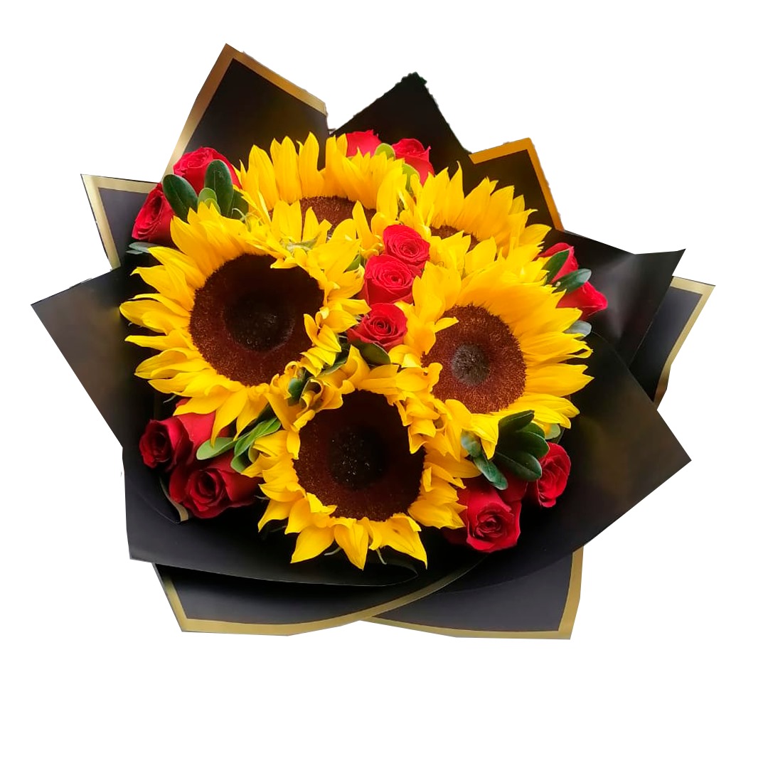 Ramo de 12 rosas y 5 girasoles. envuelto en papel liso.